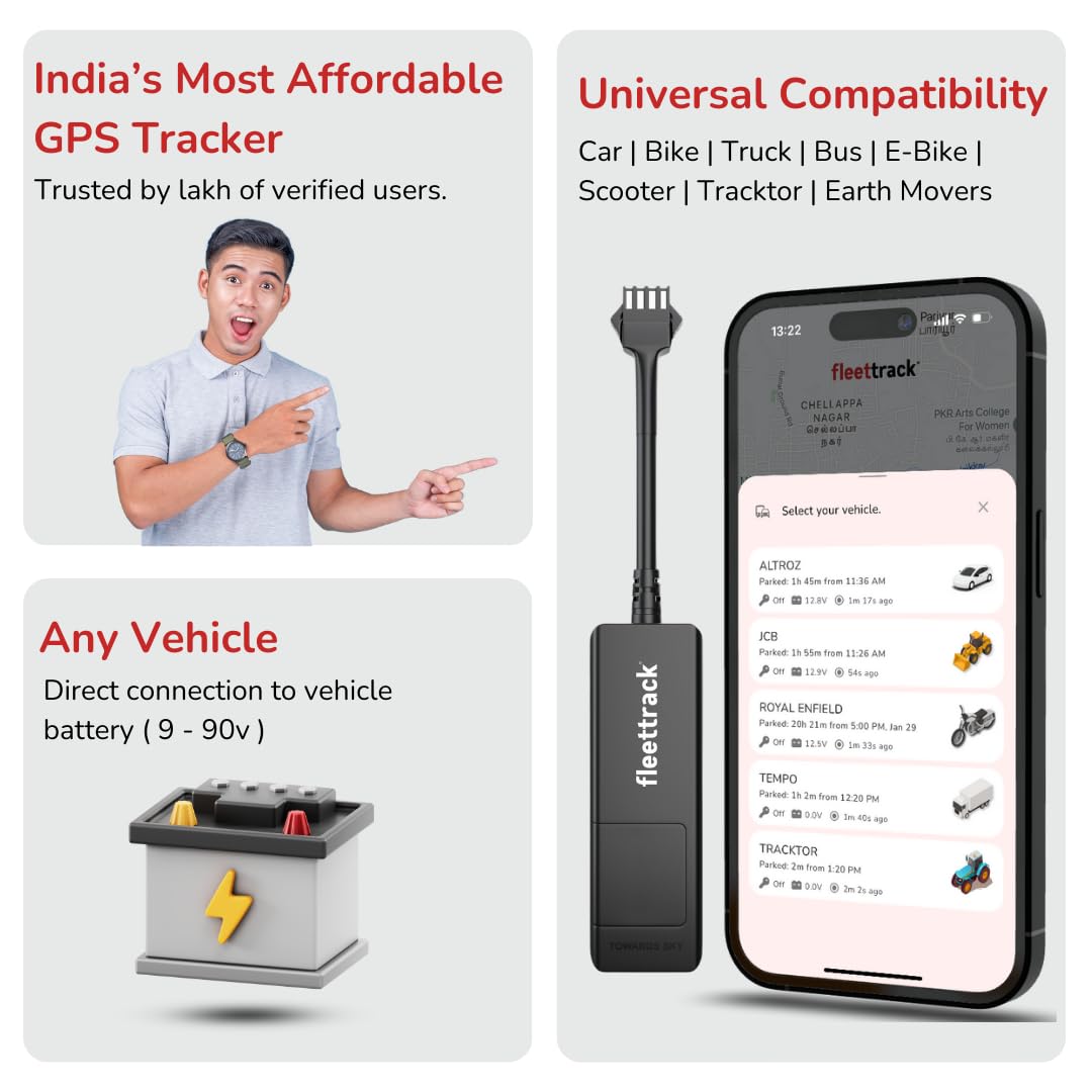 Fleettrack Pro (with 12 Months SIM Recharge) – Wired GPS Tracker for Car, Bike, Scooty, EV, Trucks | Live Location, Instant Engine ON/Off Alerts, Theft Alarms with Next-Gen Mobile App