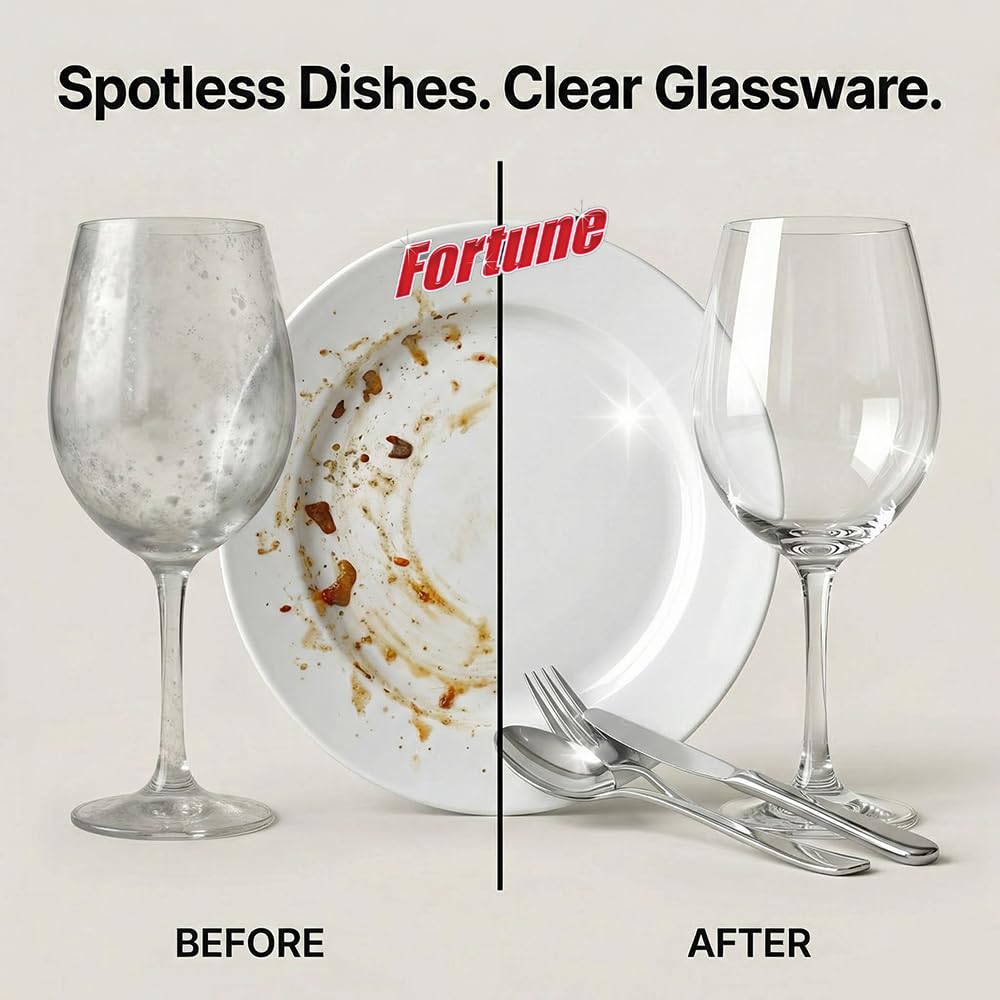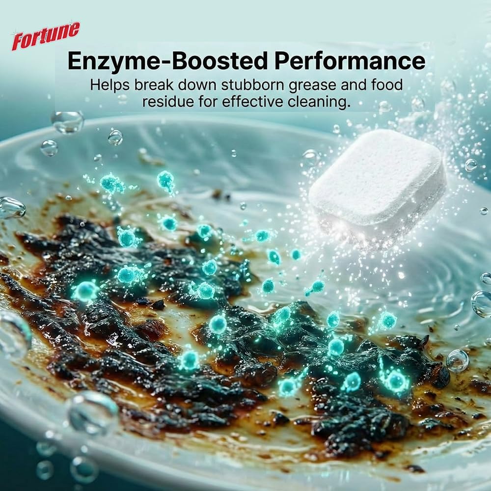 Feel the freshness of sparkling clean utensils after every wash with Fortune 5 in 1 dishwasher tablets. Now Fortune dishwasher tablets have the power of enzymes. Our new formula thoroughly removes the toughest of stains such as tea and coffee, dried on food and grease. Dishes, glassware come out sparkling clean. The Indian style of cooking is a lot different from western countries. Our products are specially made for India. Fortune dishwasher tablets also prevent build up of lime scale.