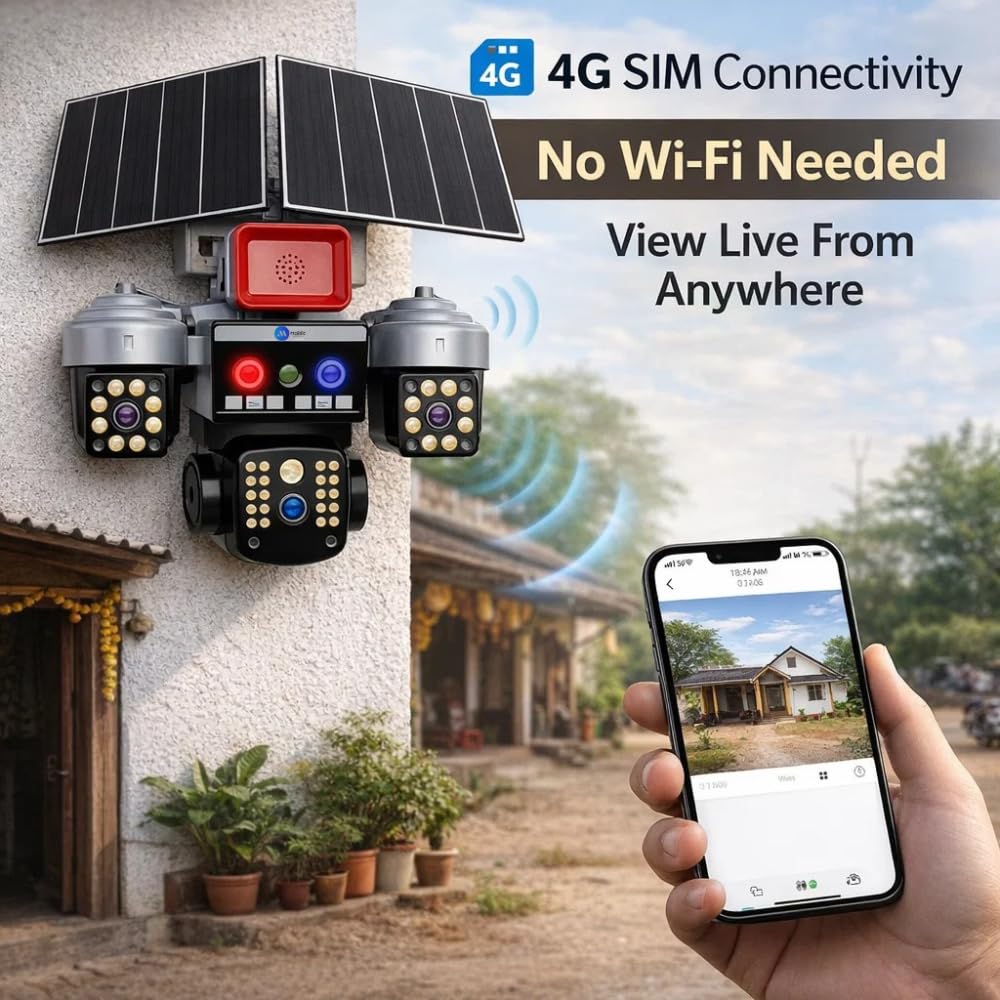 [4G SIM + Dual Solar Panel Truly Wireless Security]: No Wi-Fi? No problem. Operates on 4G SIM connectivity and is powered by dual high-efficiency thin-film solar panels with a built-in 16000 mAh battery, delivering up to 1-week battery backup. The advanced thin-film solar technology enables up to 3× faster charging compared to regular solar panels, ensuring 24×7 surveillance even during power cuts and cloudy days.