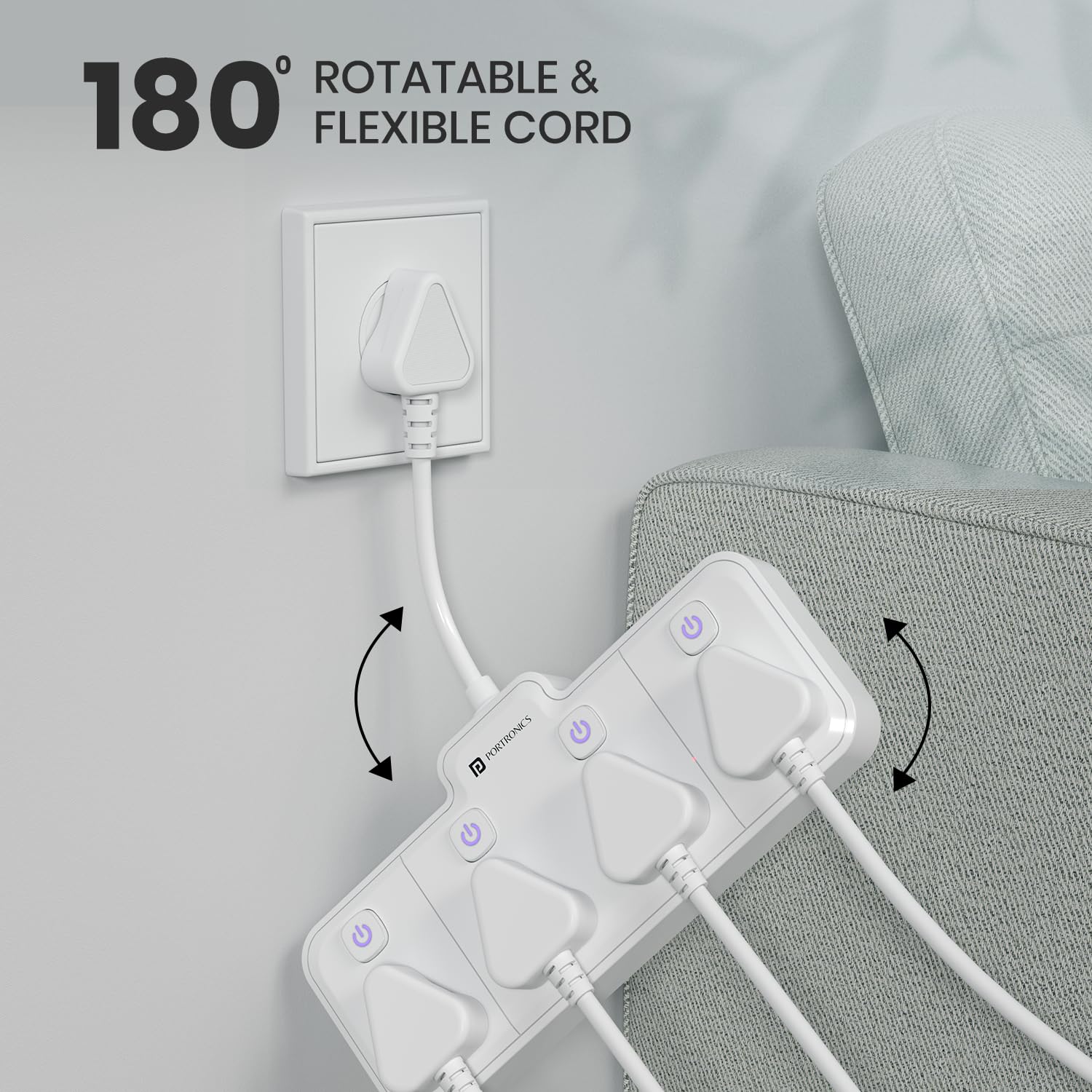This compact 4-in-1 power extender is designed to simplify everyday charging and power needs without clutter. It features four universal sockets with individual power switches, allowing you to control each connected device independently. The 180-degree rotatable and flexible short cord ensures easy installation while preventing cable tangles and blockage of nearby wall sockets. Built with child-safety shutters and a fire-retardant PC body, it offers reliable protection for home and office use. With advanced safety features such as short-circuit, surge, over-voltage, and overheating protection, this power extender safely supports devices up to 2500W, making it ideal for laptops, mobile chargers, appliances, and workstations.