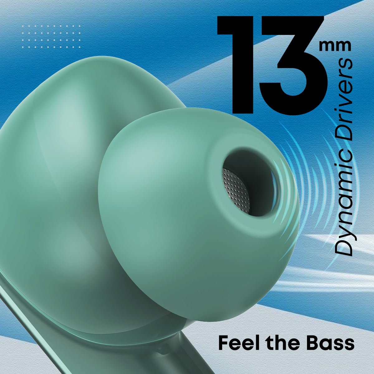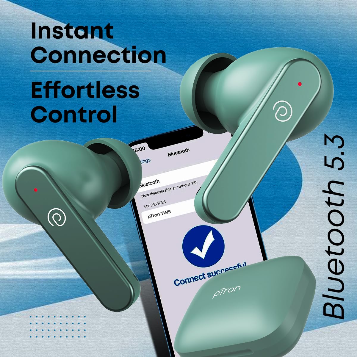 pTron Bassbuds Gomax in-Ear TWS Earbuds w/Dual HD Mic & AI-ENC Calls, 36Hrs Playtime, Pristine Sound, 13mm Drivers, Bluetooth 5.3 Wireless Headphones, Voice Assist, Type-C Charging & IPX5(Sage Green)