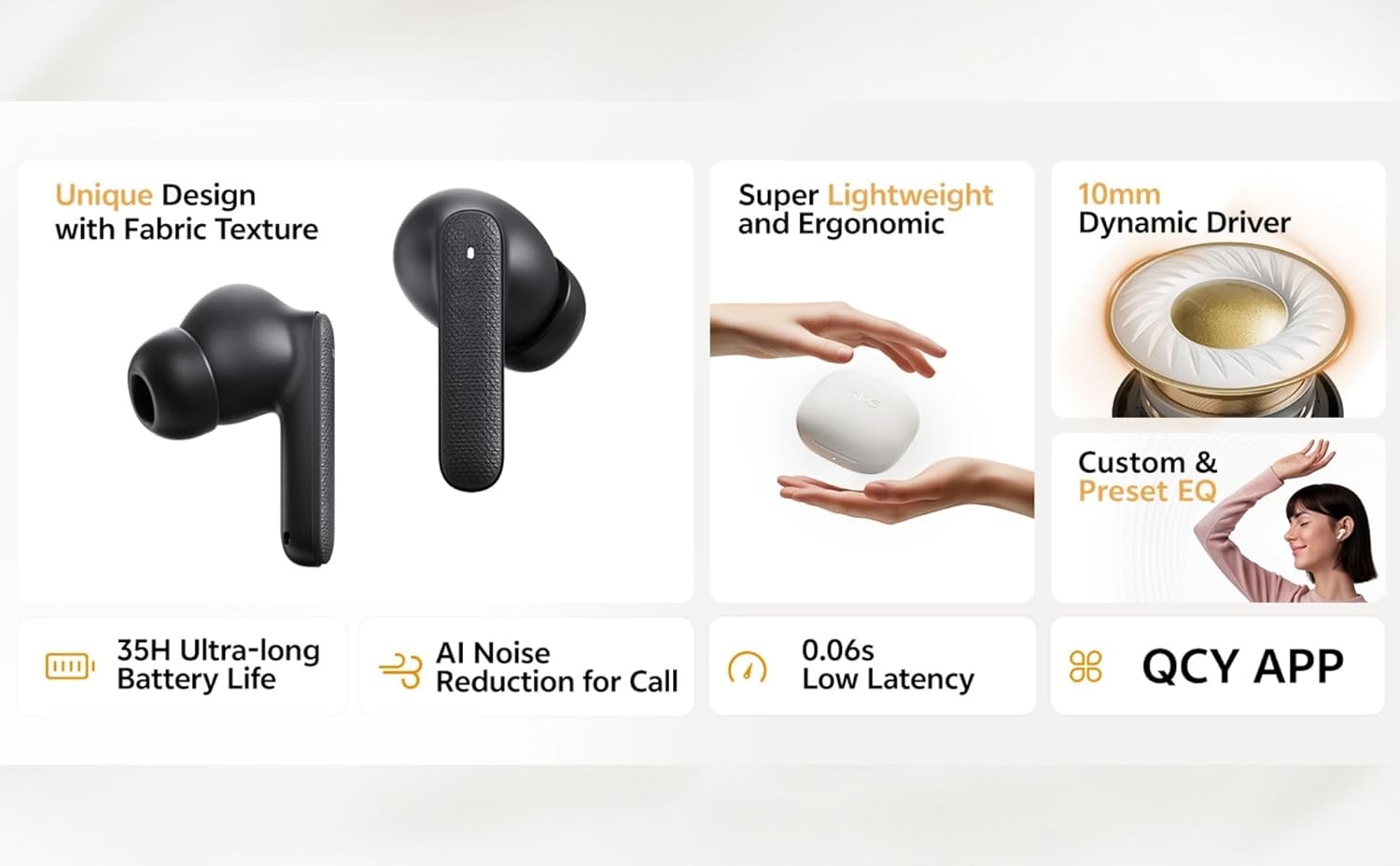 Lightweight fabric touch and S-curved ergonomic design, it stays stable in the ear and provides long lasting comfort 10mm dynamic drivers and nine different EQ modes (Pop, Rock, Classic, etc.) Offering bass, treble and customizable audio experience with AI-powered wind noise reduction technology and clear sound-transmitting microphones Offers call quality 35-hour total battery life, seven hours of use on a single charge and an hour of music listening time with 10-minute charge Bluetooth 5.3 technology, IPX4 water, 68ms latency gaming mode and wireless headphones with QCY app support offers