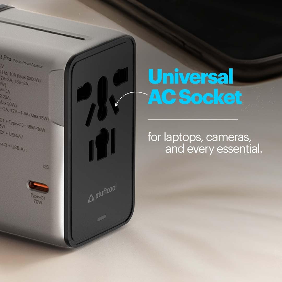 Stuffcool Jetset Pro Smallest 70W GaN International Travel Adapter with 4 USB Ports EU UK USA AUS Plugs SFC 2.0 Charges MacBook Laptops iPhones in 200 Countries