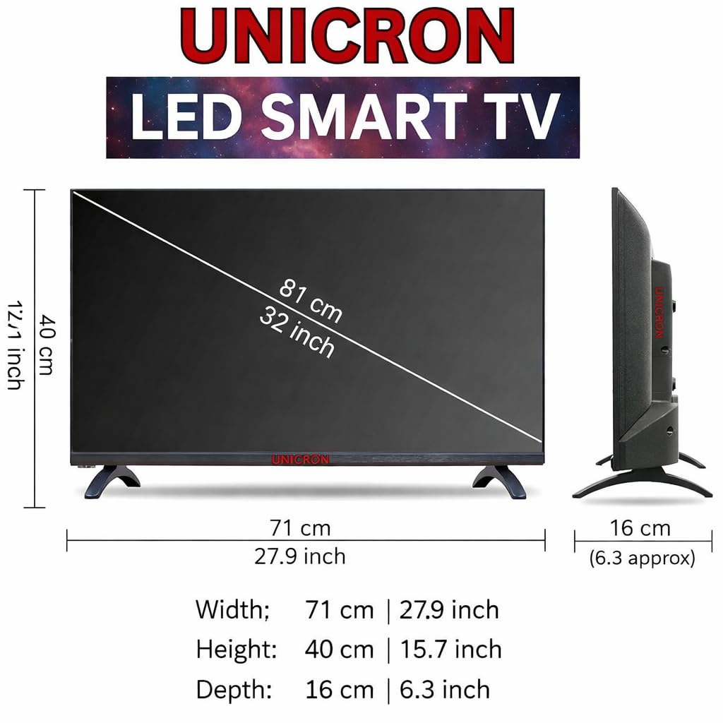 UNICRON :– 32 Inch HD Ready Display – 80 cm (32”) LED screen with HD Ready resolution for clear and comfortable viewing Display & Design 32 Inch (80 cm) HD Ready LED Display Resolution: 1366 x 768 Pixels Slim & modern design suitable for bedroom, kitchen & office use