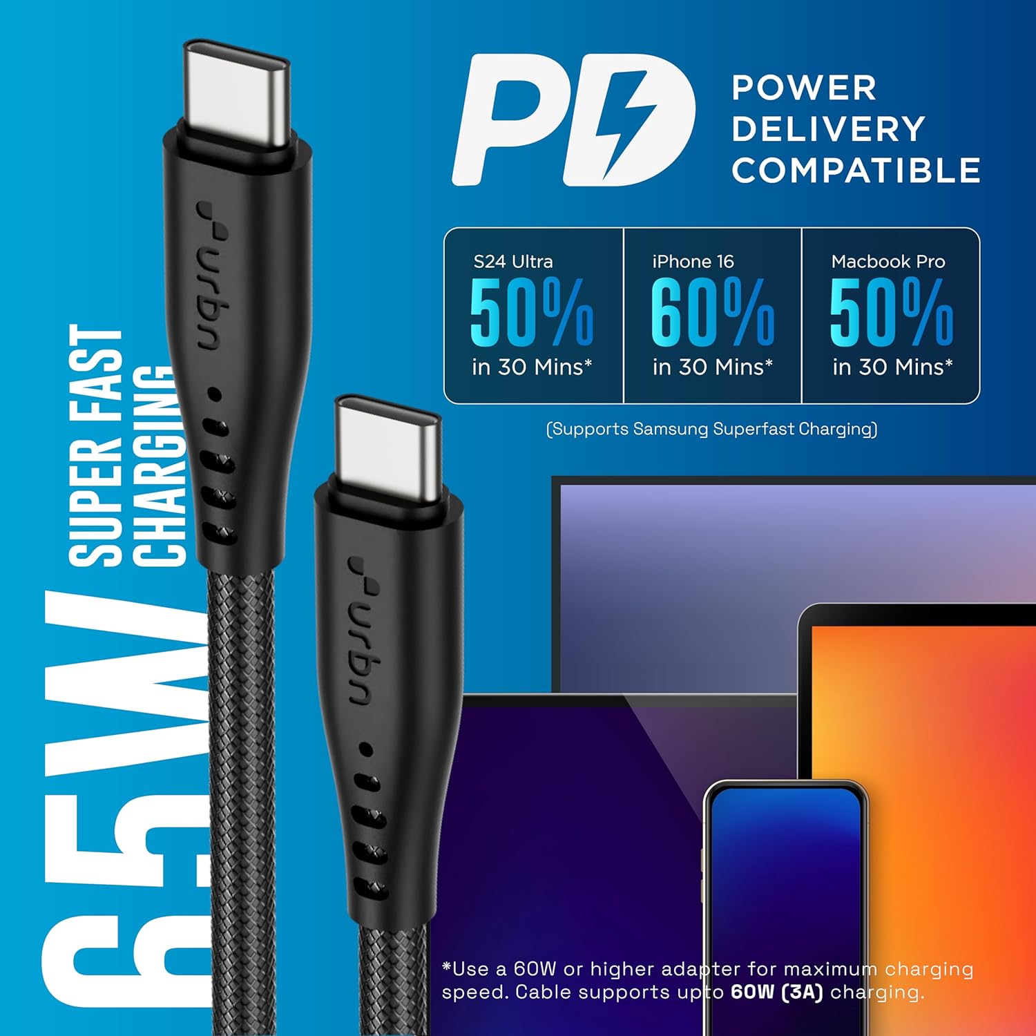 URBN Flow Cord 65W Super Fast Charging Cable | Type C to C | Supports Apple Car Play & Android Auto| Super Fast Charging and Data Transfer | Nylon Braided 1.5 Meter | 6 Months Warranty (Black)