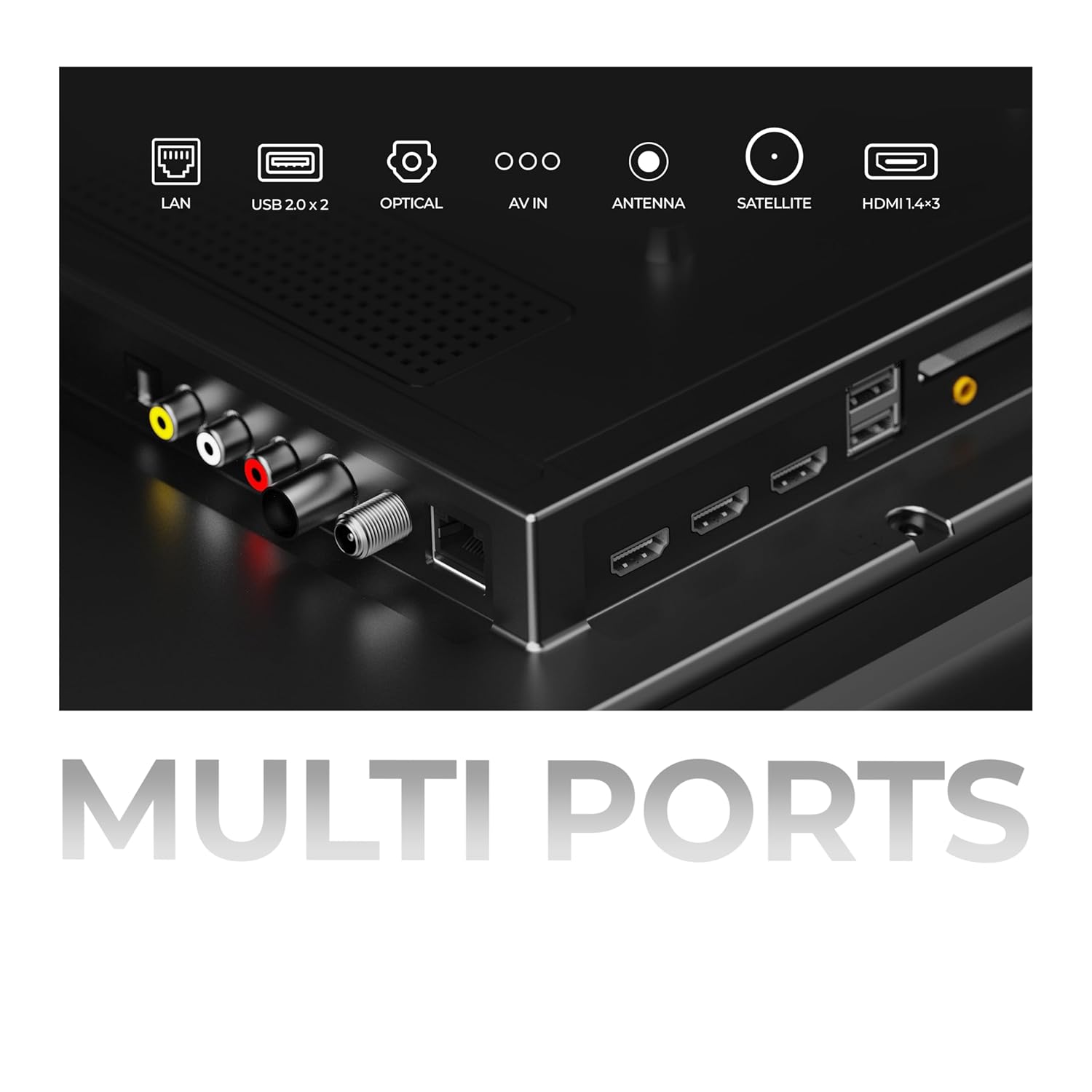 Connectivity: 3 HDMI Ports | 2 USB port | 1 Lan | 1 Antenna Input | 1 Satellite Input | 1 Digital Audio Out | 1 AV IN Adapter | 1 Headphone | Bluetooth | Dual Band Wifi